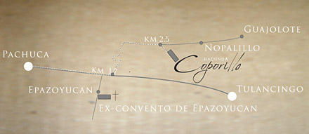Coporillo is a word for the tree known as amate prieto, a variety of fig that must have been distinctive of the locale, for it was the name given in the mid-nineteenth century to this pulque-producing hacienda in the municipality of Epazoyucan. The former Hacienda Coporillo comprises a total of 55 hectares in a cactus-filled landscape at a height of 2700 meters above sea level, which affords a one-of-a-kind panoramic view of the region.